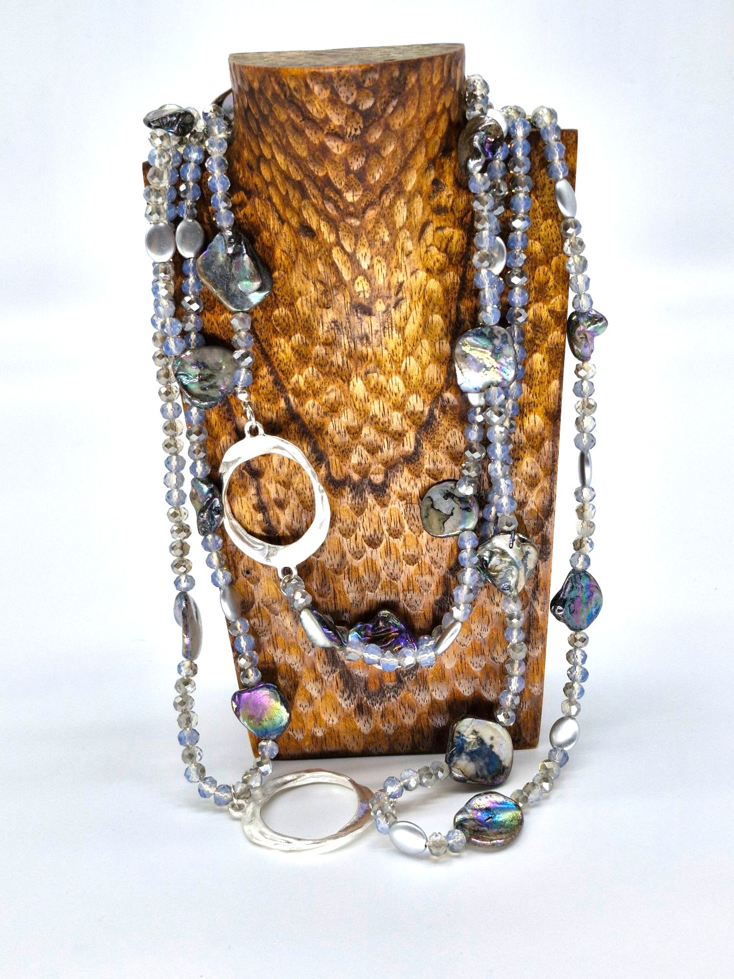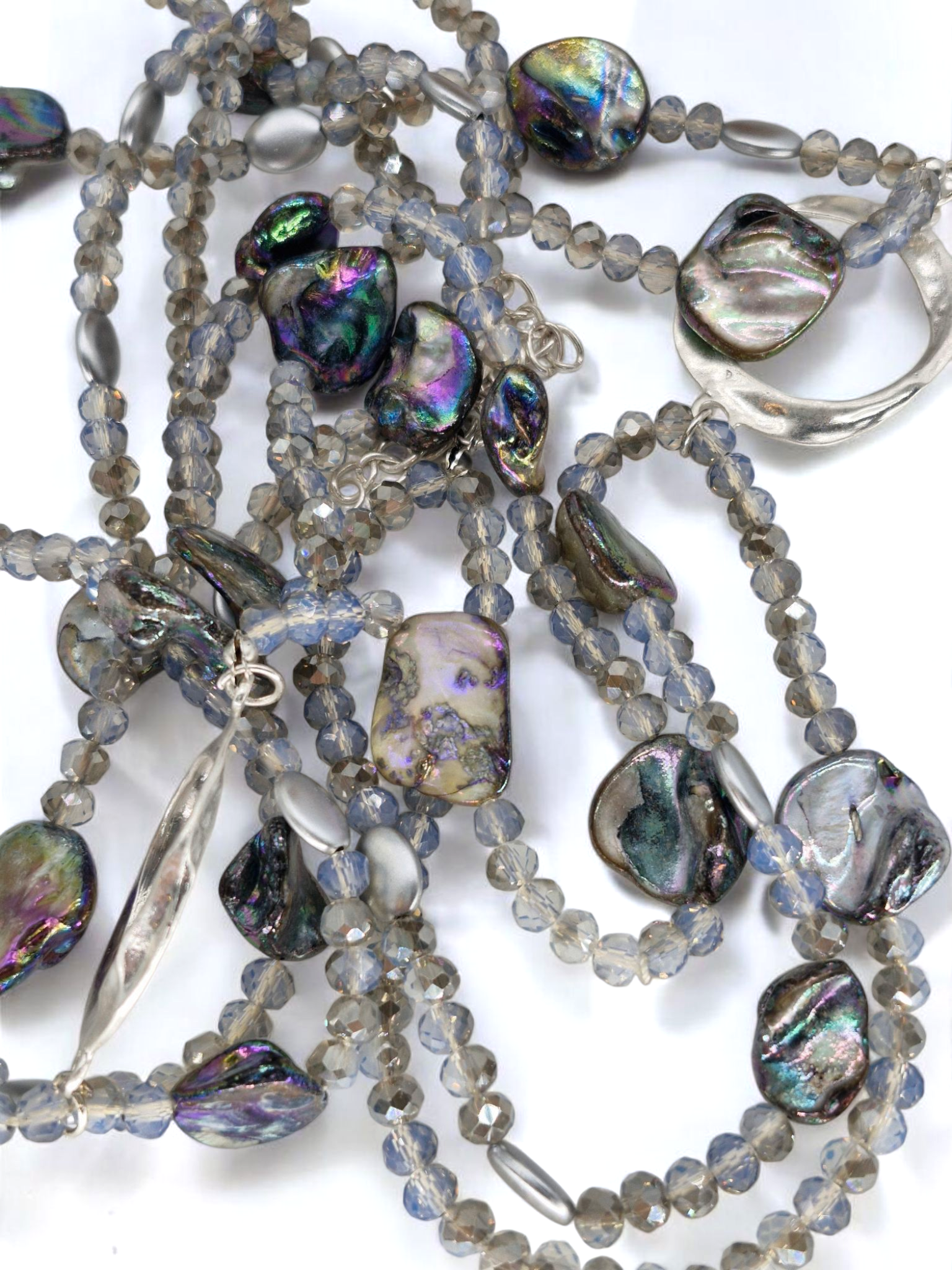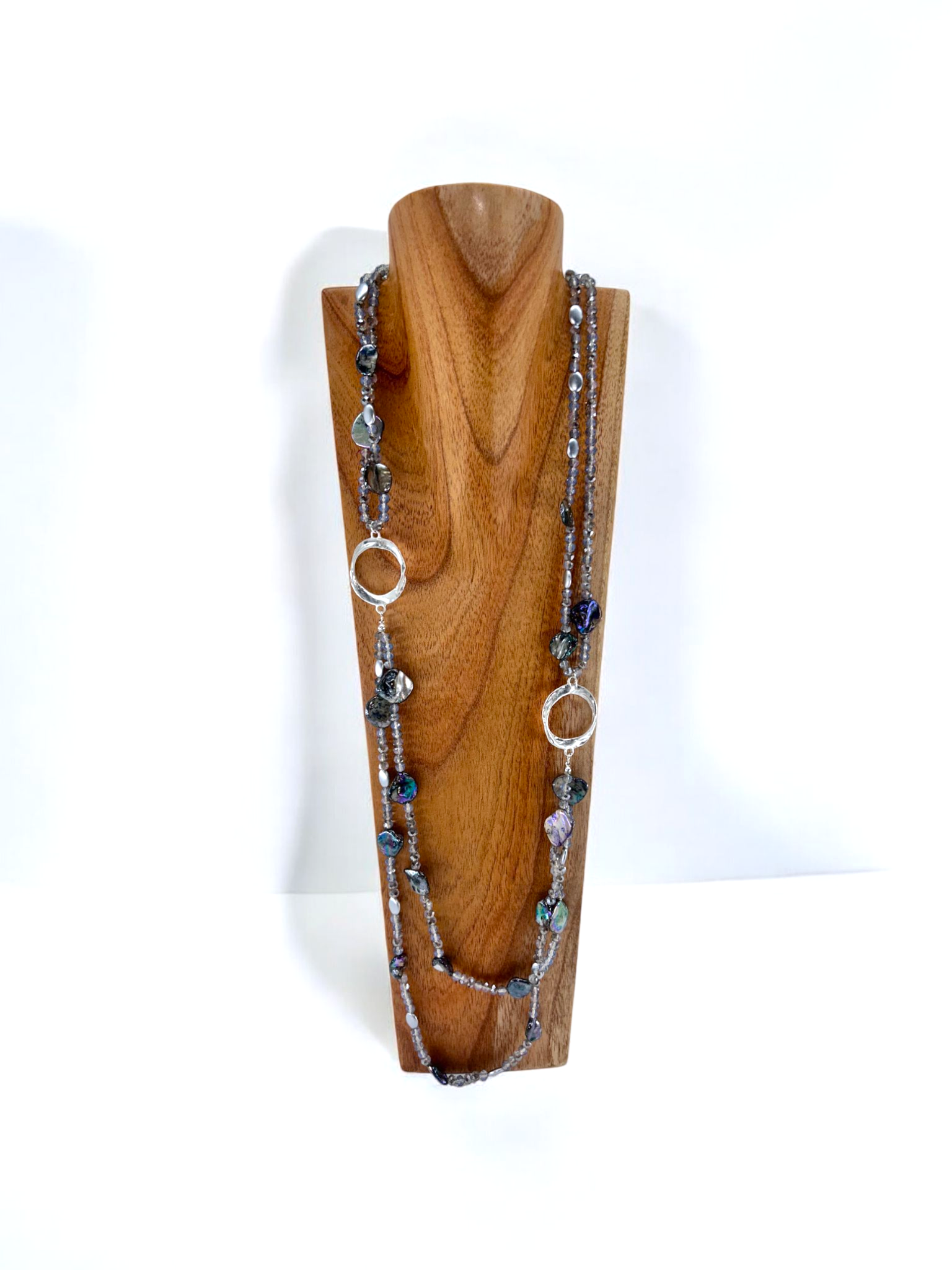 This chic long necklace features two layers of grey-toned abalone stone-style beads, paired with sleek silver metal accents. The subtle, iridescent shades of grey in the abalone stones create a sophisticated, multi-dimensional effect, while the silver details add a touch of modern flair.