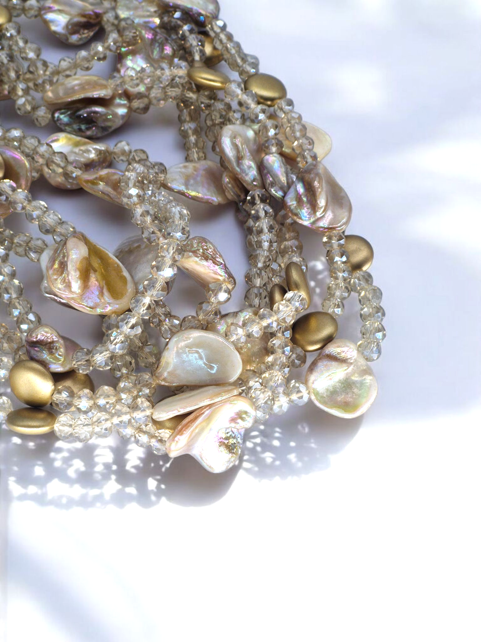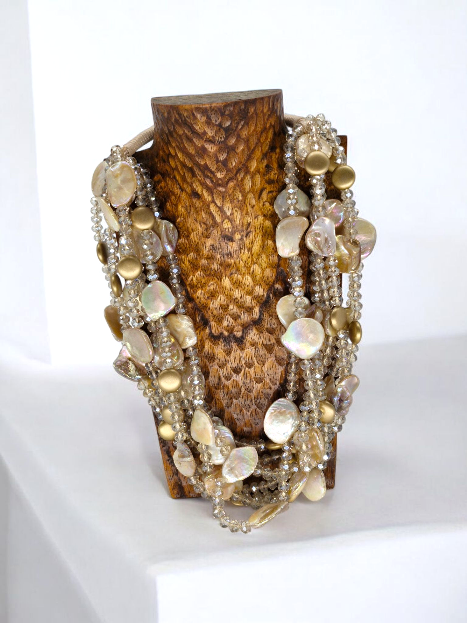 This layered short necklace features a blend of cream and neutral-toned crystal beads, accented with stone-effect details. The gold hardware and subtle gold accents add an elegant touch, while the layered design creates a relaxed, bohemian feel. Perfect for evoking laid-back coastal vibes, this necklace pairs beautifully with casual and summer-inspired outfits.