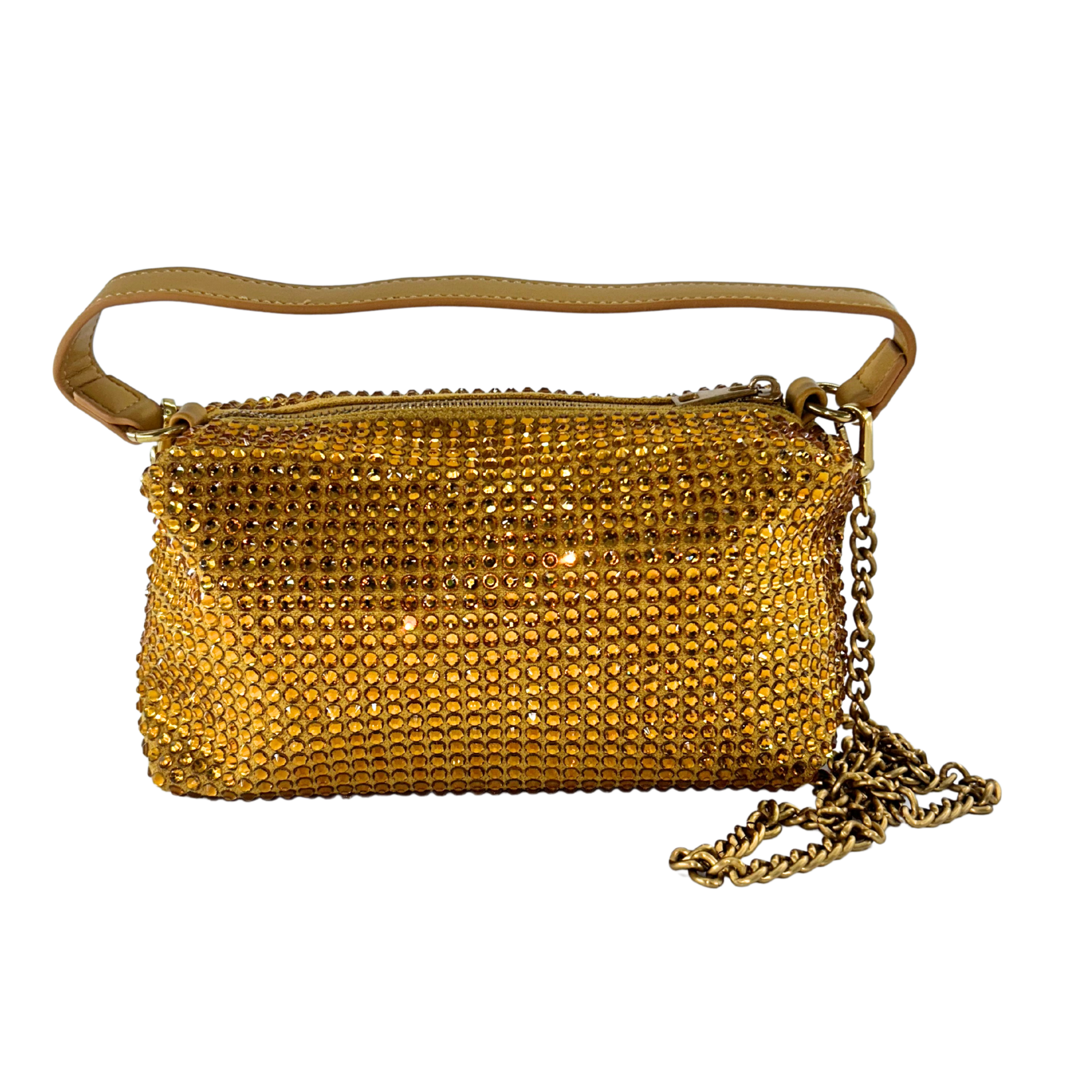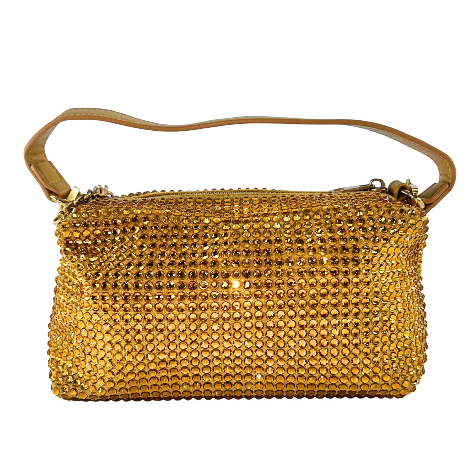 Bright and charming, this small rectangular mustard suede-style bag adds a playful pop to any look. Adorned with sparkling yellow gems and finished with a sleek shoulder strap, it’s the perfect statement piece for day or night.