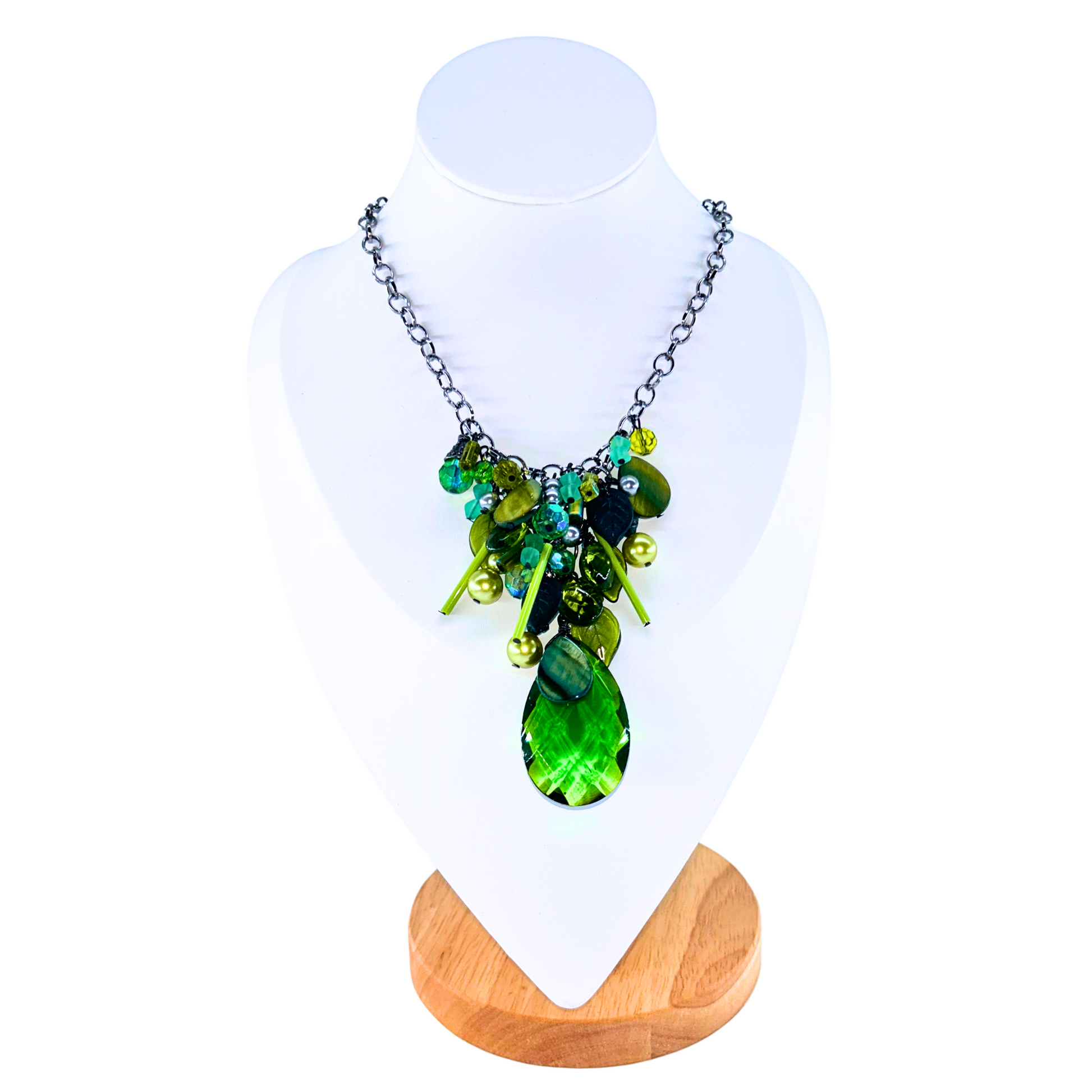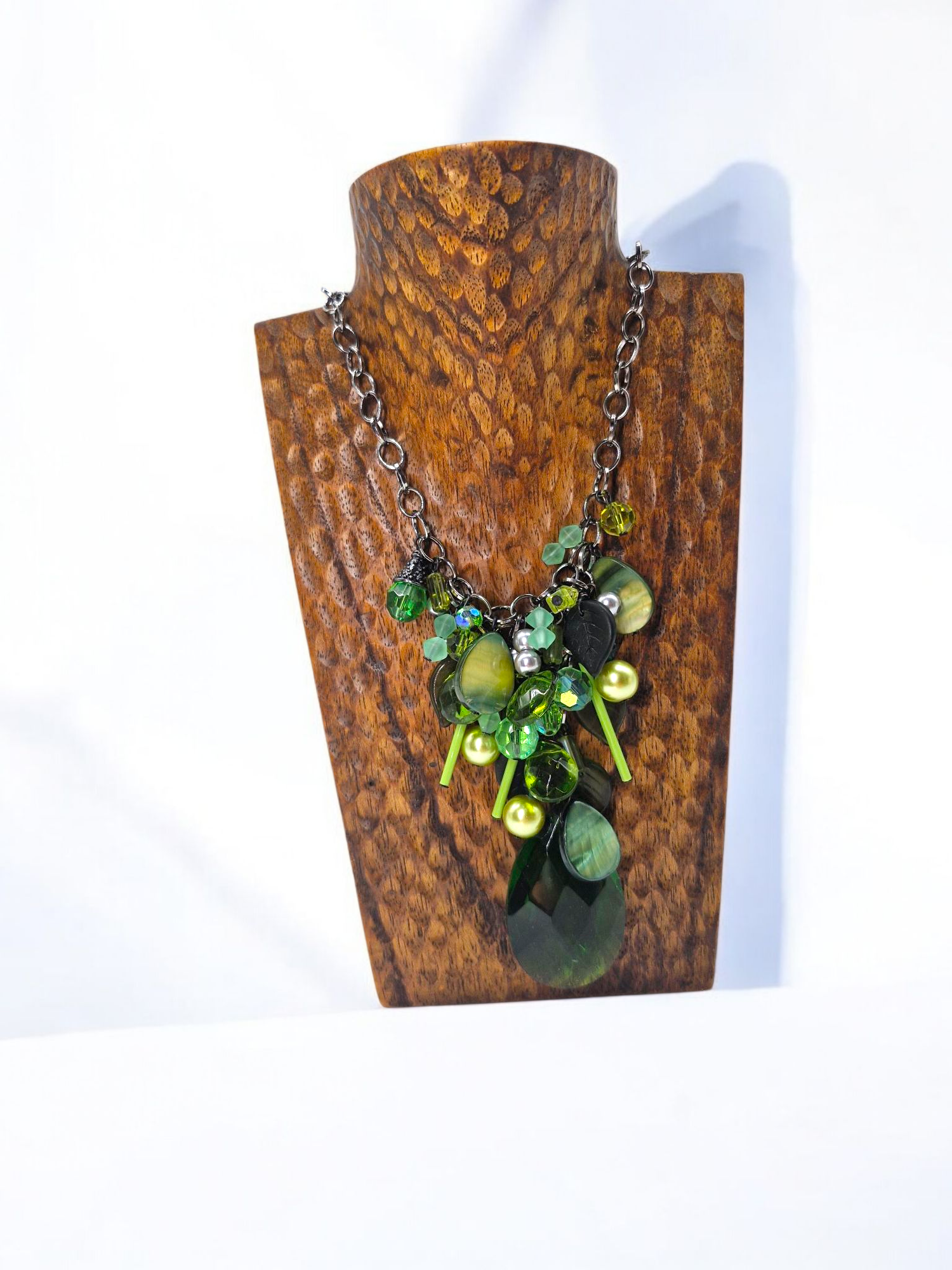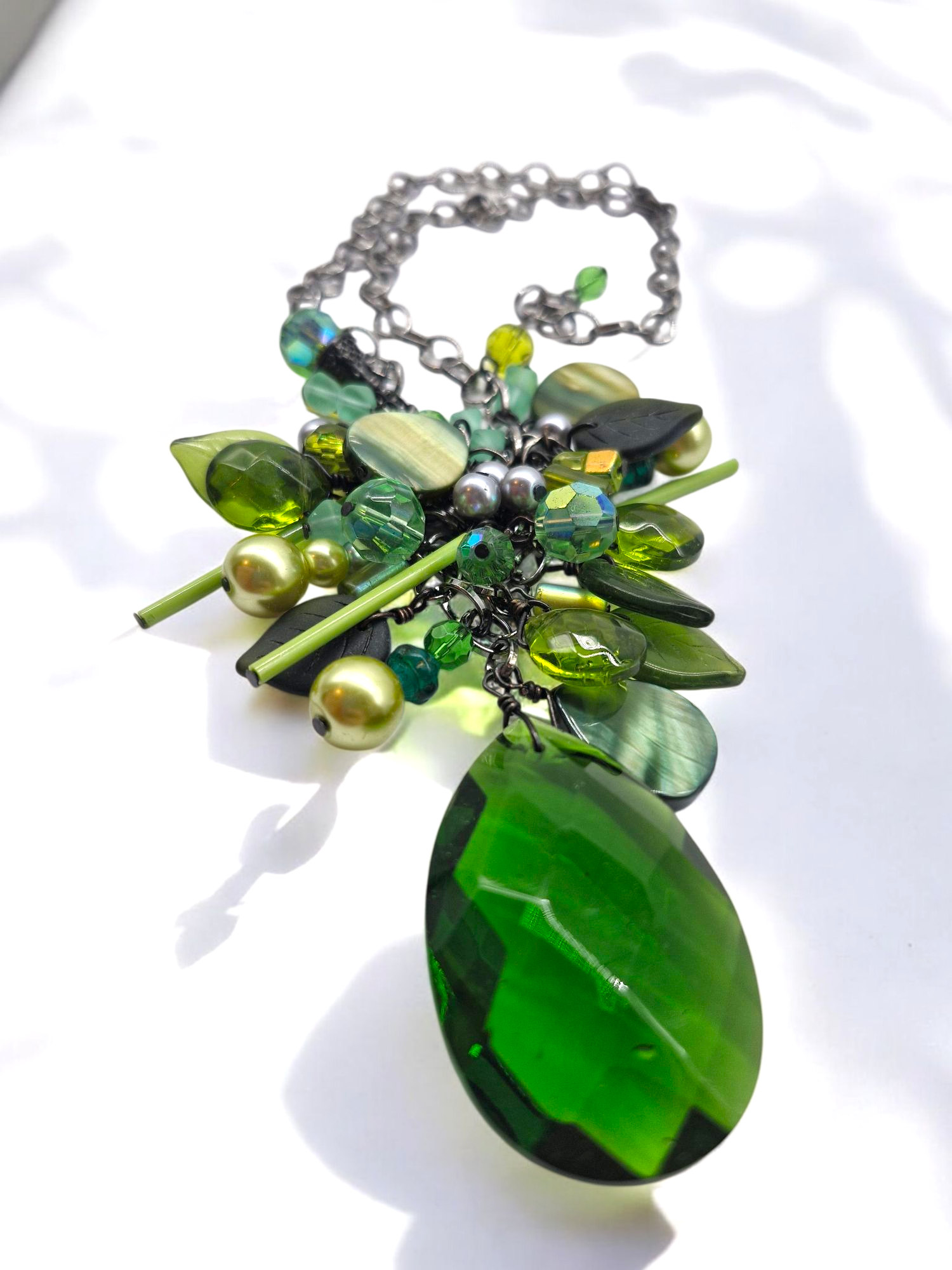 This striking necklace features green beads with a sleek gunmetal finish, creating a bold contrast. At the centre, a large teardrop-shaped deep green pendant adds a touch of drama and elegance. Perfect for making a statement, this necklace combines modern design with vibrant colour for a sophisticated and eye-catching look.
