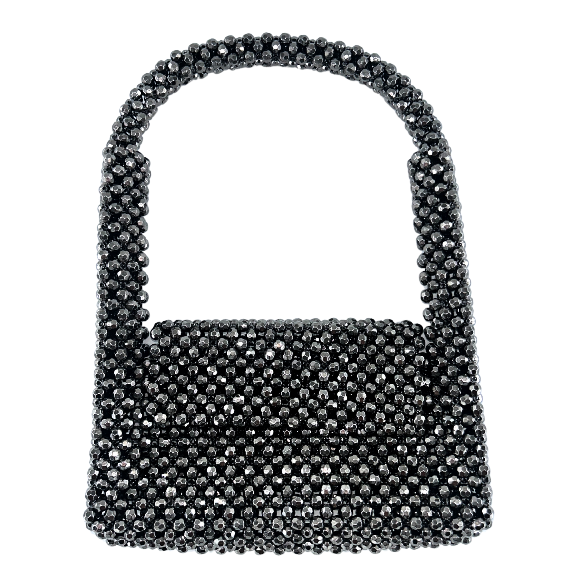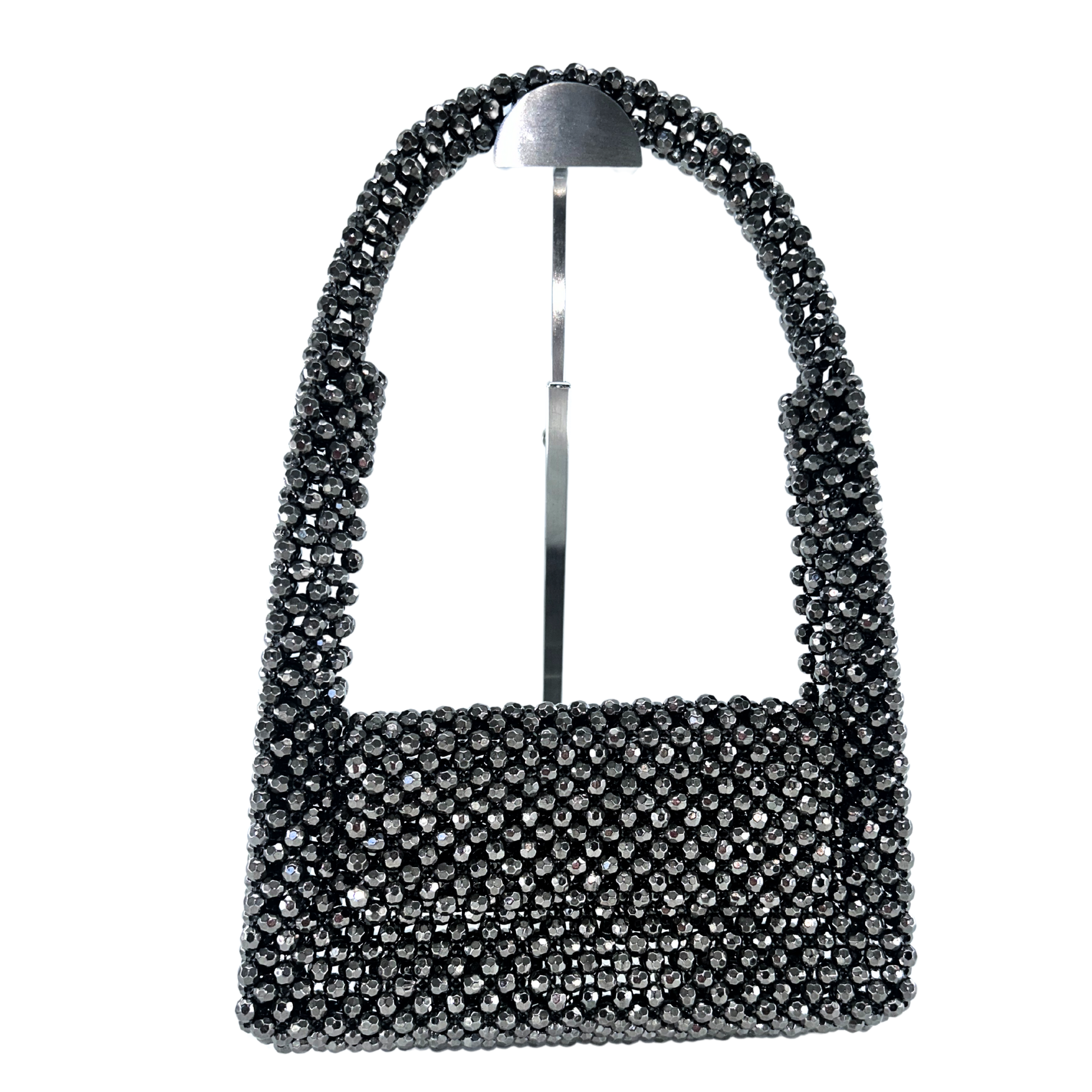 This handmade graphite beaded bag is a sleek statement piece, designed to shine from day to night. It can be styled handheld or worn over the shoulder. Perfect for evenings out or as a bold finishing touch to elevate your look.