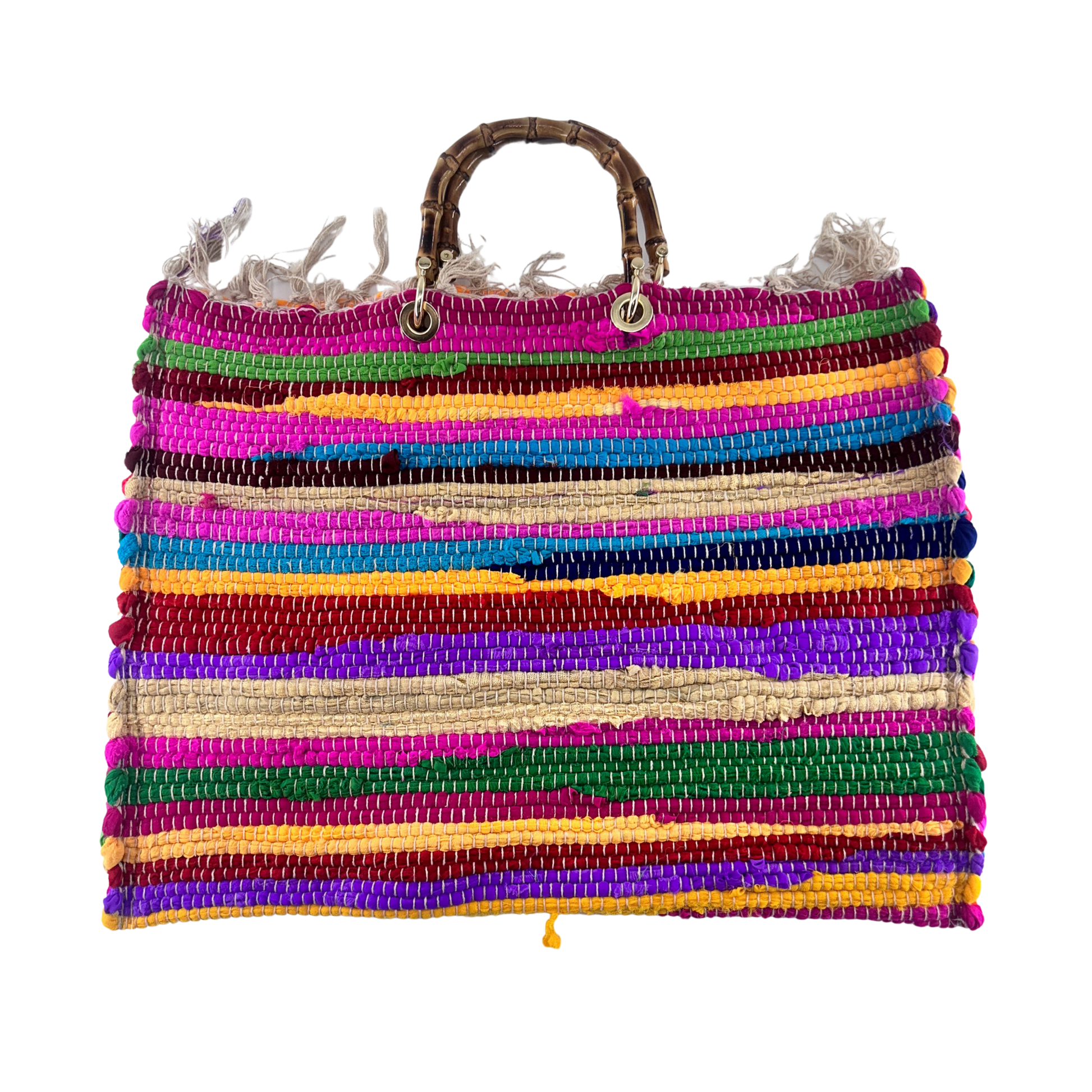 Due to the nature of the fabric, the reverse side of the bag may not be symmetrical in colour; however, it maintains the same style and harmonious colour tones throughout, adding to its unique, artisanal charm.