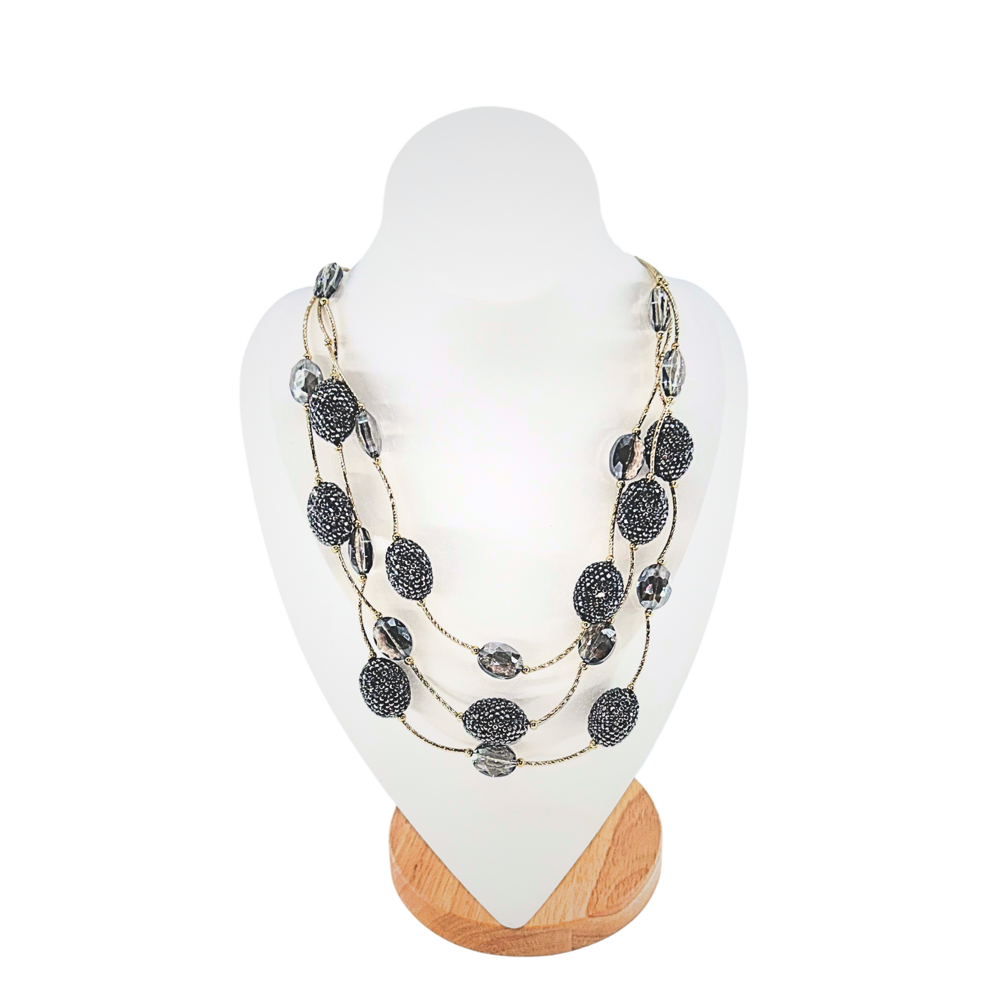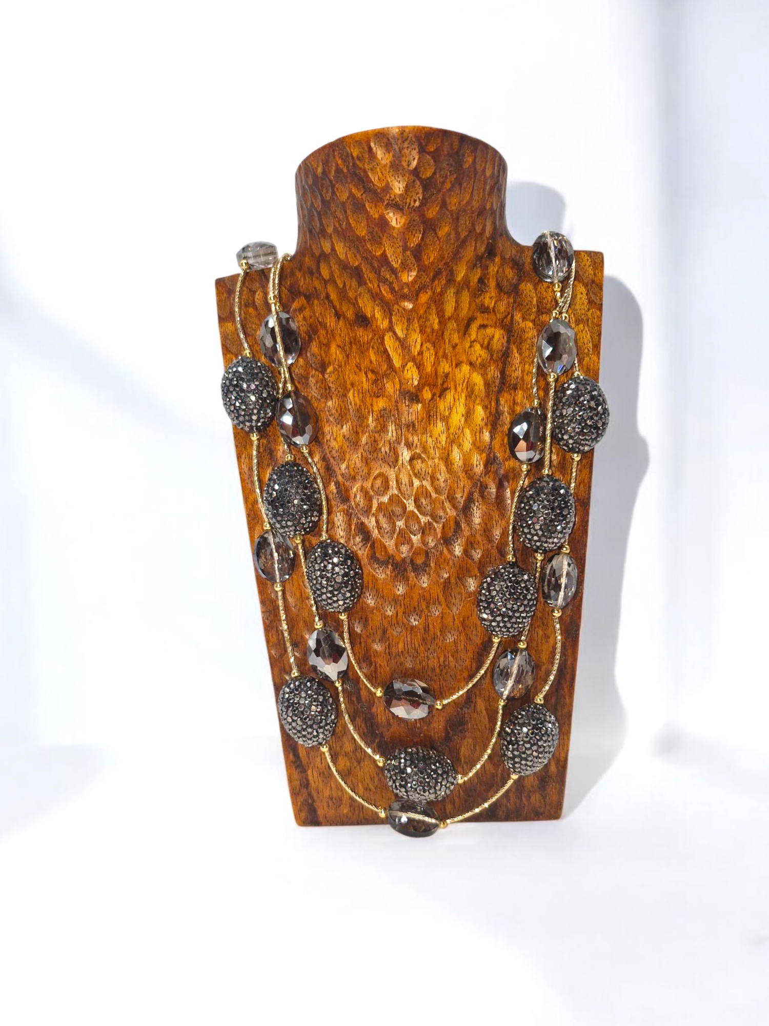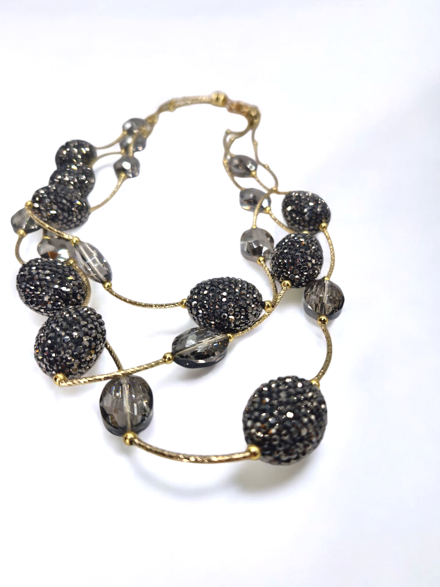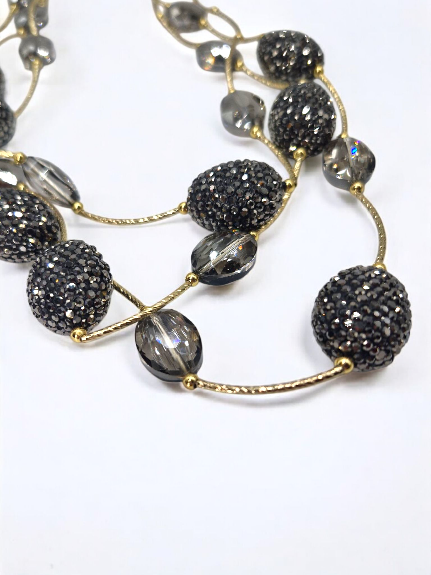 This sophisticated short layered necklace features gold hardware paired with scattered grey beads, creating a chic and refined look. Large oval diamante beads, intricately encrusted with sparkle, add a touch of glamour and luxury. Perfect for elevating both day and evening outfits, this piece offers a striking balance of elegance and shine.