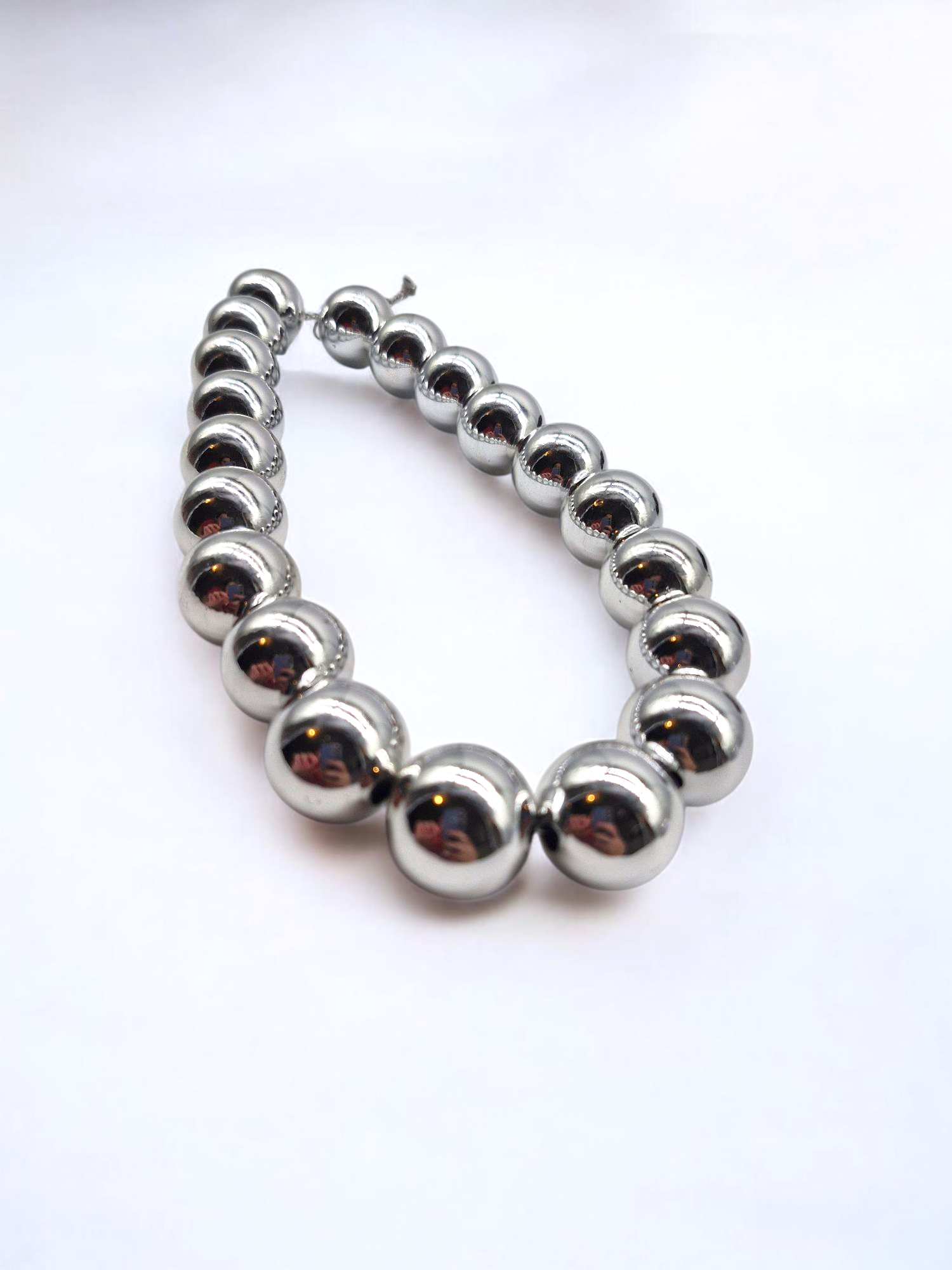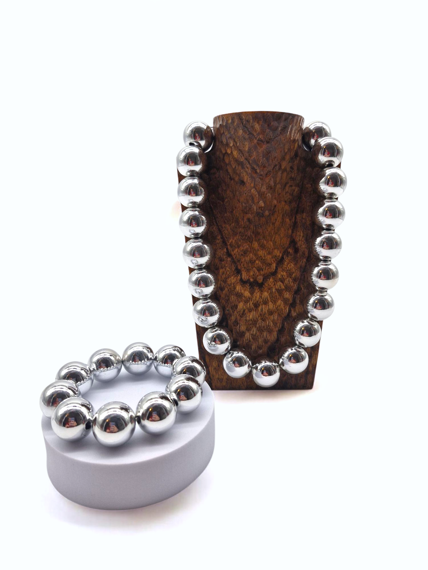 This modern set features smooth, chrome silver spheres that create a bold, contemporary look. The reflective finish of the spheres adds shine, making both striking accessories. The elastic bracelet ensures a comfortable fit, perfectly complementing the necklace and adding a sleek, minimalist touch to any outfit.