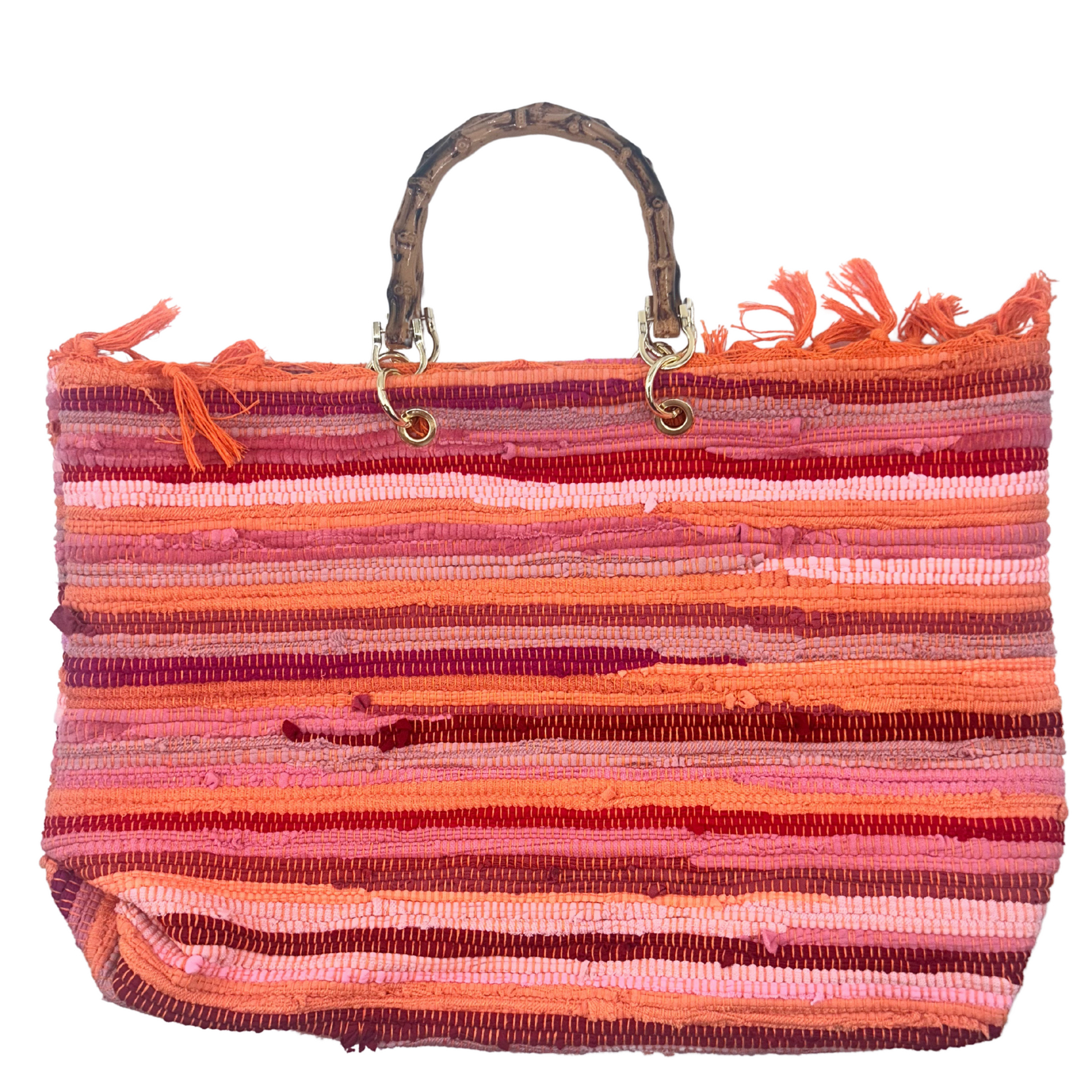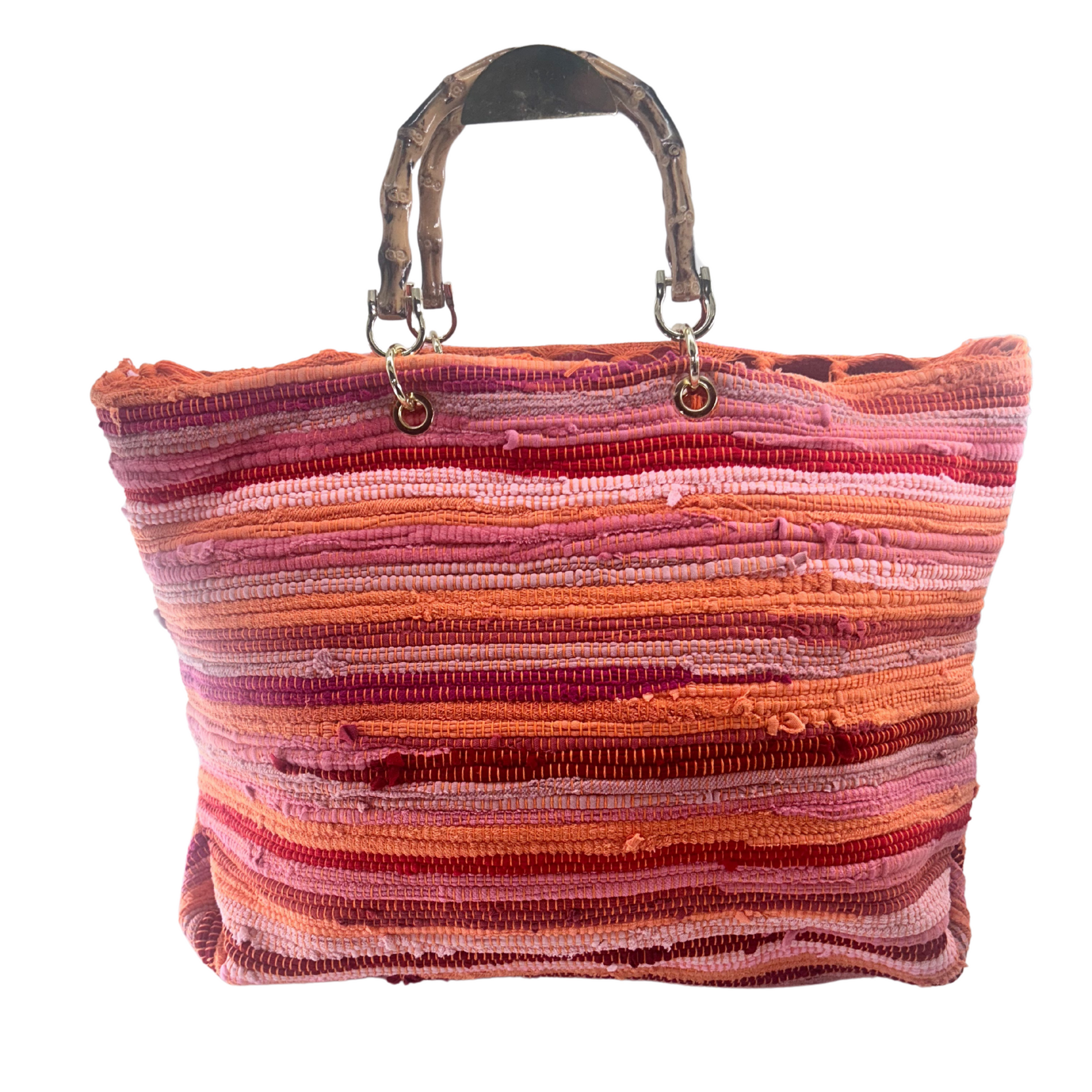 This slouchy carpet-style bag is a relaxed statement piece, featuring subtly woven threads in soft, muted tones inspired by traditional rugs. Designed with an open, easy going silhouette, it’s finished with a bamboo-style handle and gold hardware, blending effortless style with distinctive details.