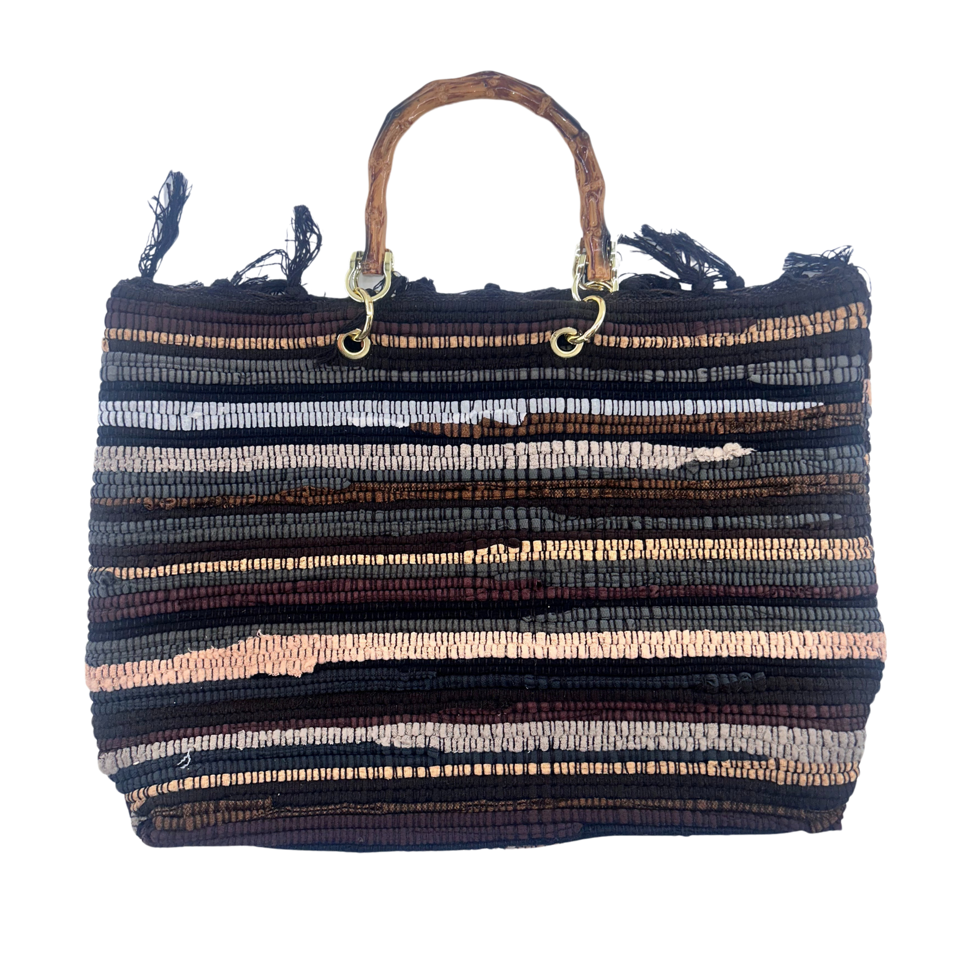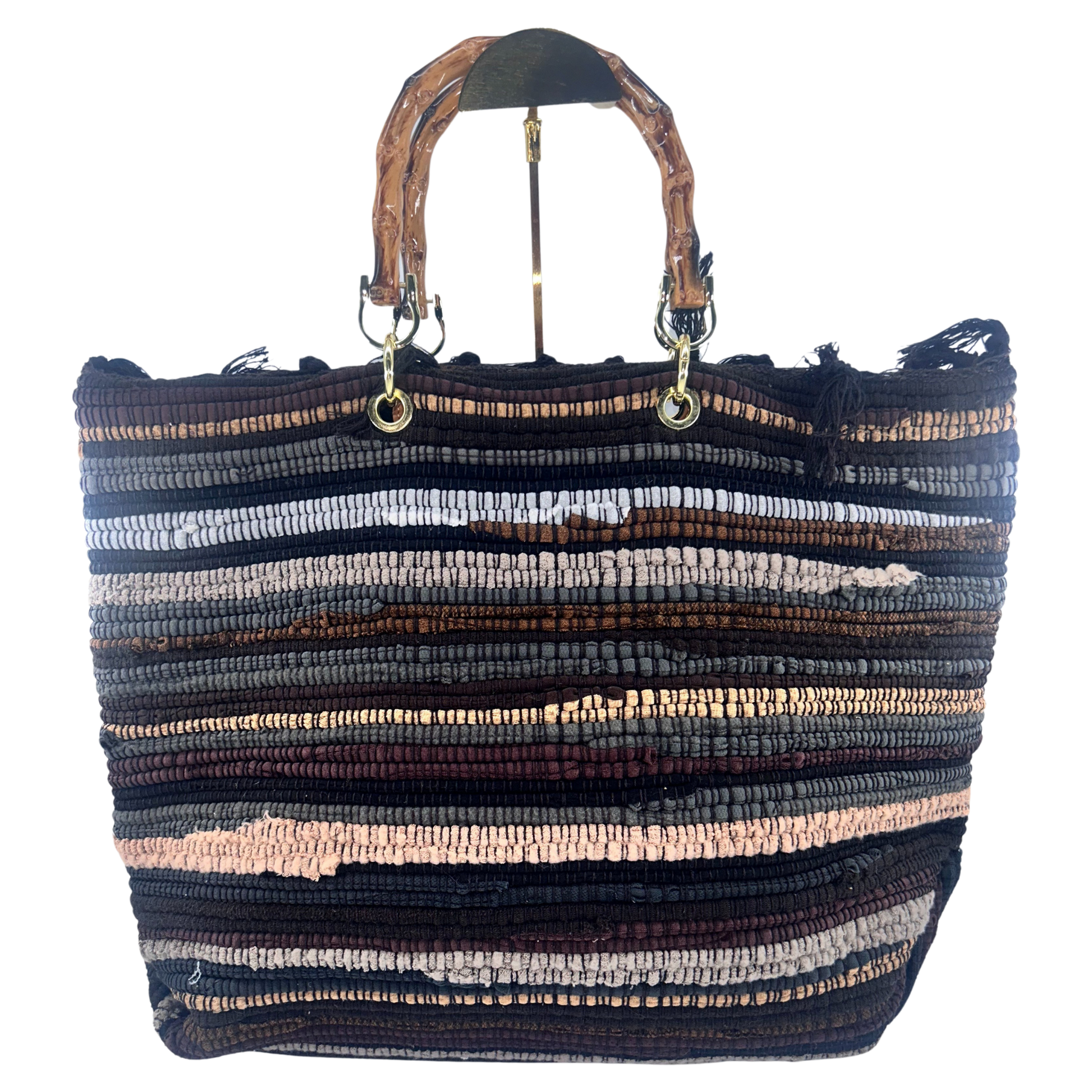 This slouchy carpet-style bag is a relaxed statement piece, featuring subtly woven threads in soft, muted tones inspired by traditional rugs. Designed with an open, easy going silhouette, it’s finished with a bamboo-style handle and gold hardware, blending effortless style with distinctive details.