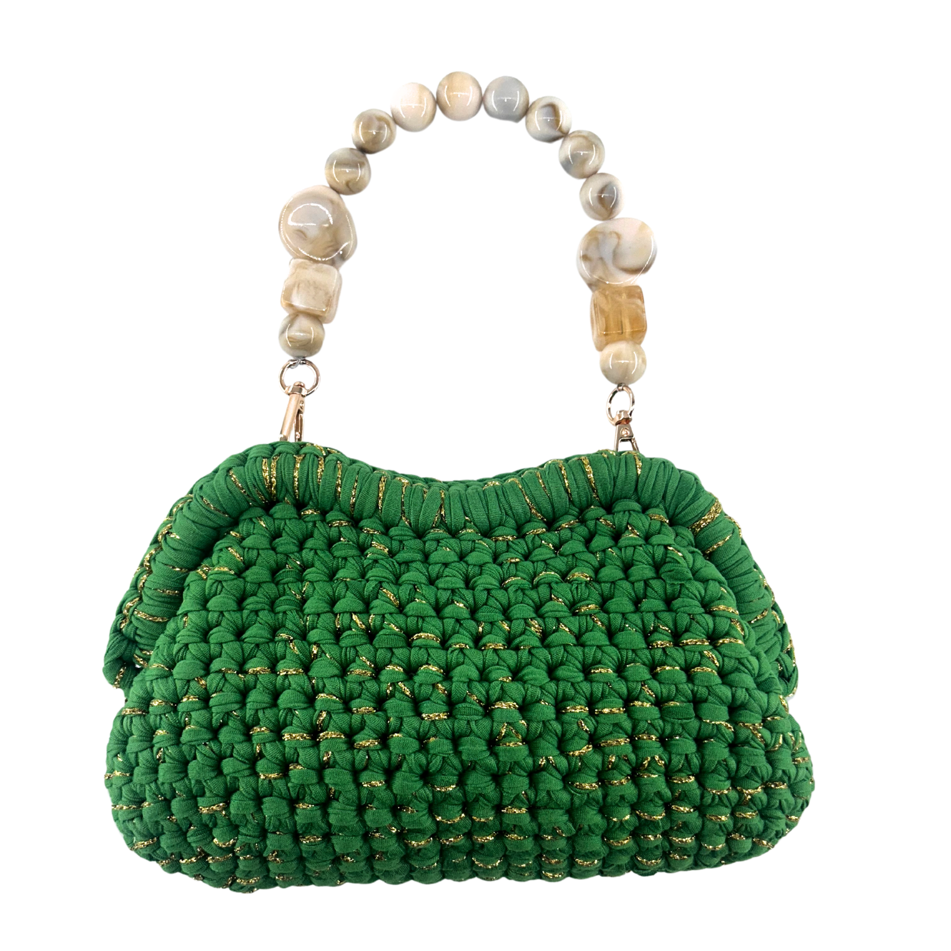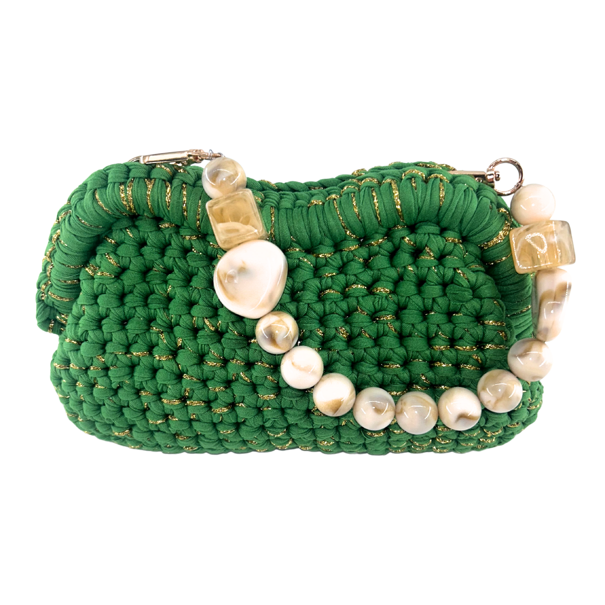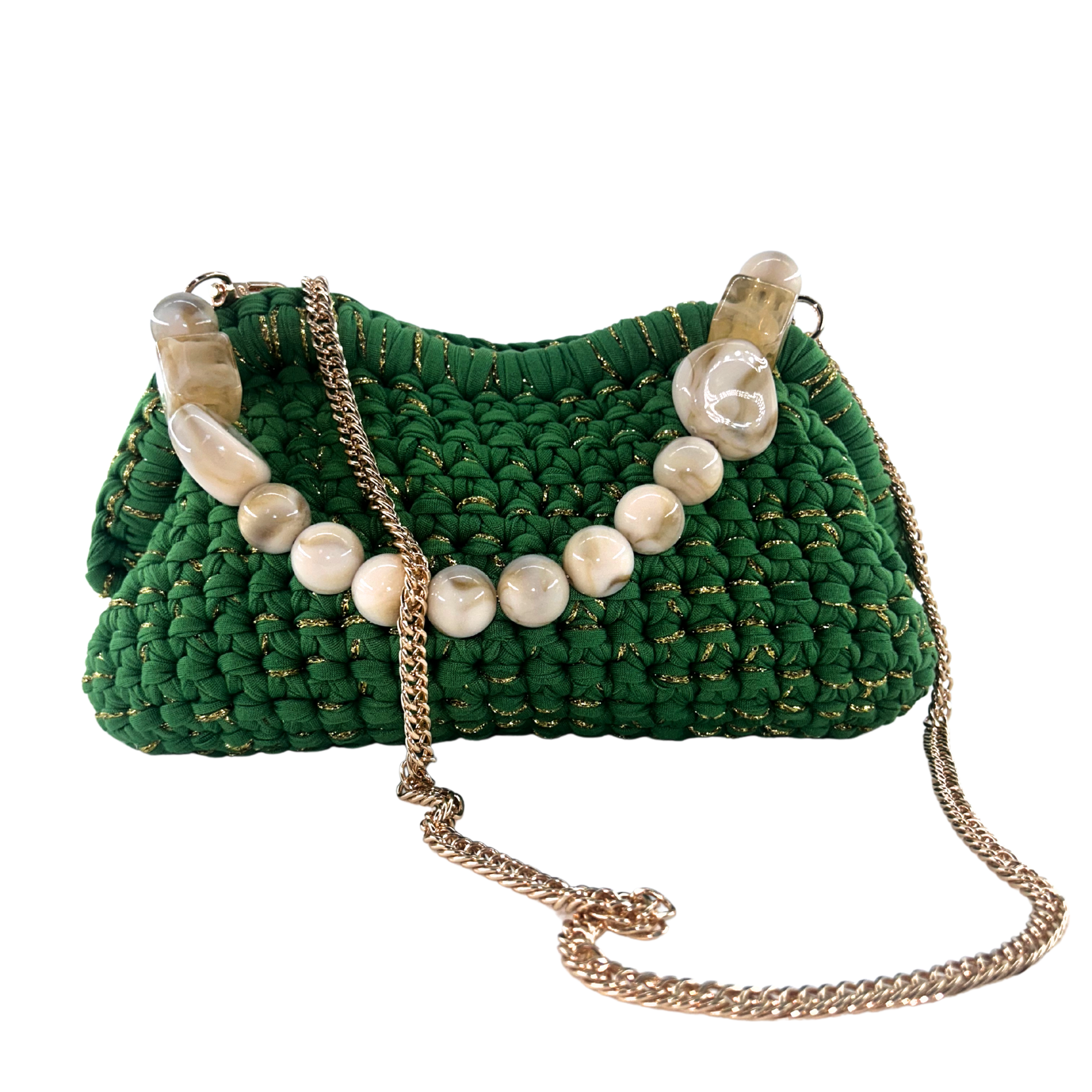 This small sized fabric clutch is a shimmering summer essential, woven with delicate gold threads for a touch of understated glamour. It features gold hardware and a detachable gold chain strap for shoulder wear, while a cream marble-style resin chain offers a chic handheld option. Light, versatile, and effortlessly elegant—perfect for sun-soaked days and warm evenings.