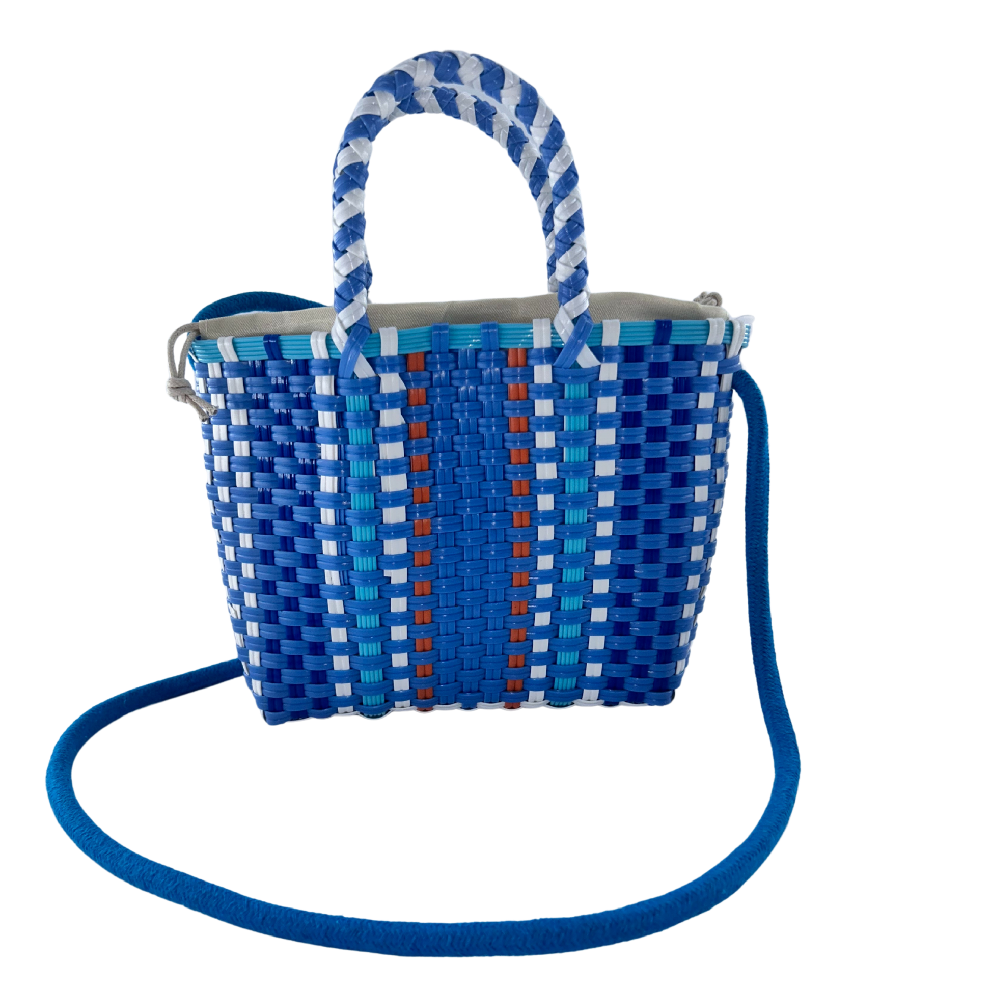 Fresh and fun, this handwoven plastic tote showcases a fun palette of blue, orange and white hues in a bold check pattern. It features sturdy braided top handles and a vibrant blue rope-style short length strap making it ideal for side carry. The fabric drawstring lining keeps your essentials secure, while the lightweight, durable construction makes it perfect for sunny outings, errands, or casual days out.