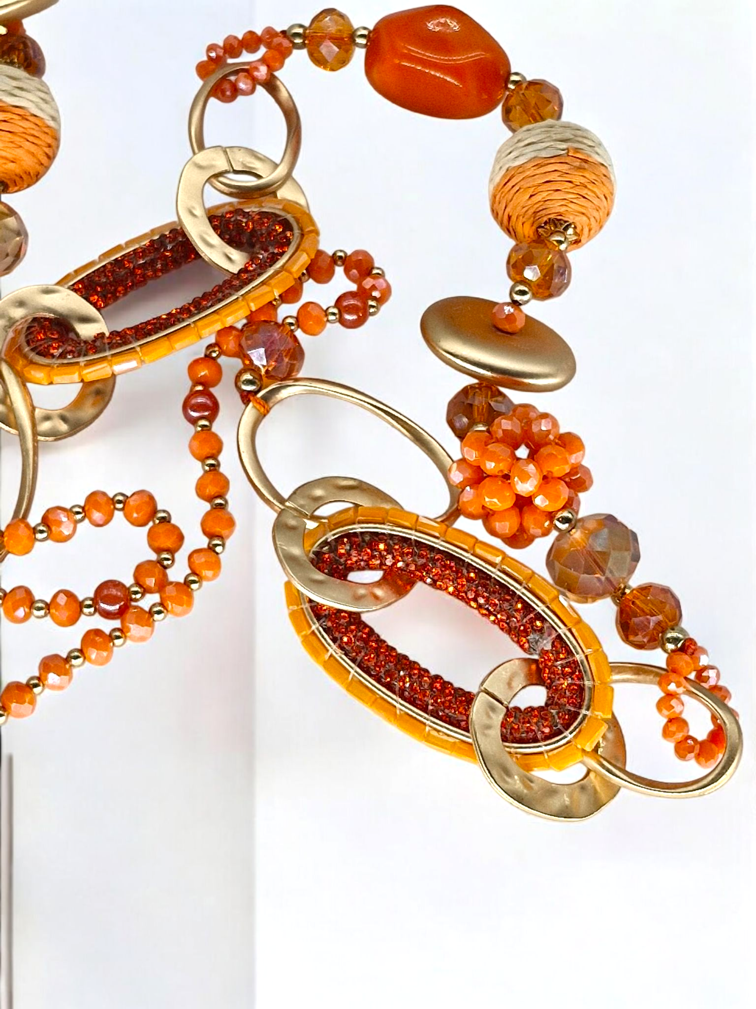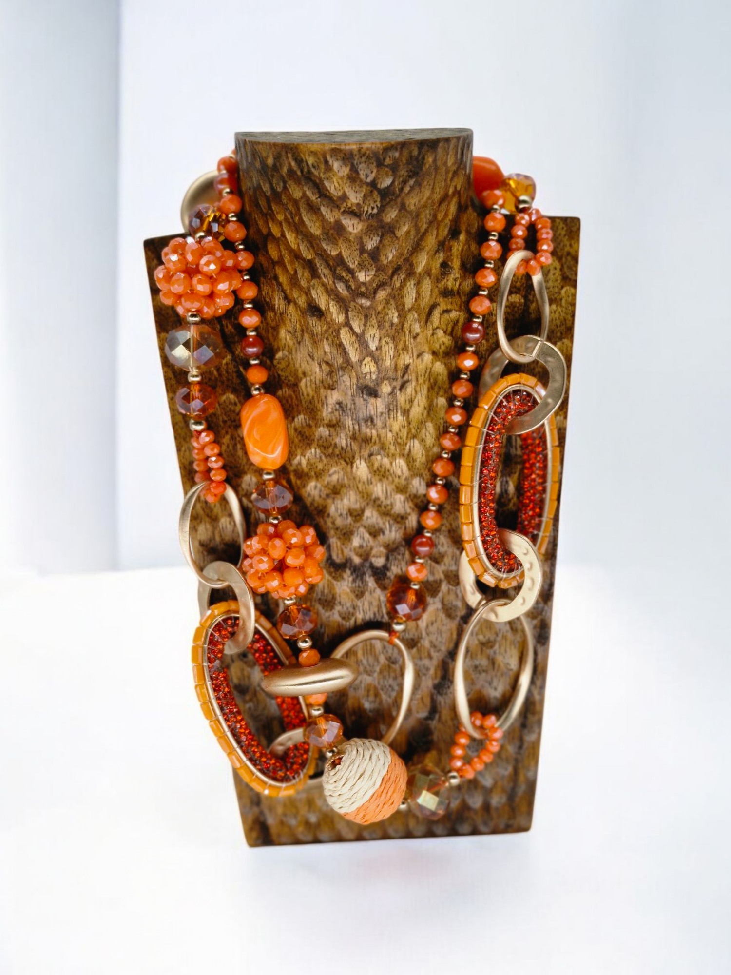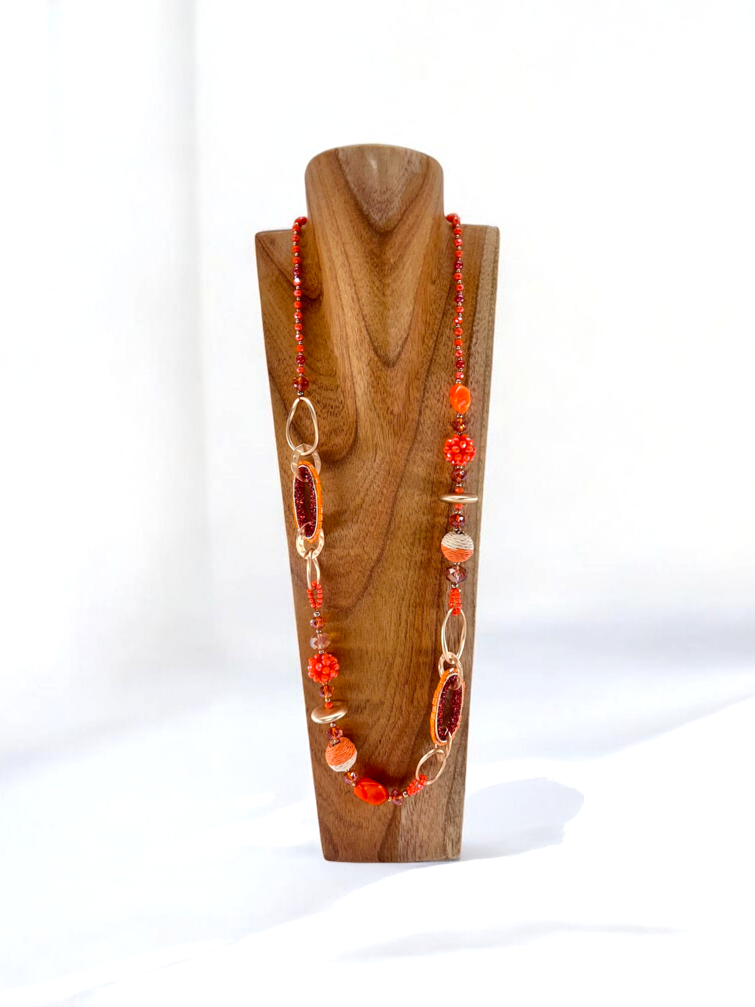 This eye-catching long necklace features a mix of vibrant orange oval and sphere beads, complemented by gold beads and sleek gold hardware. The combination of different bead shapes and the rich orange colour creates a bold, modern look, perfect for adding a pop of brightness and elegance to any outfit.