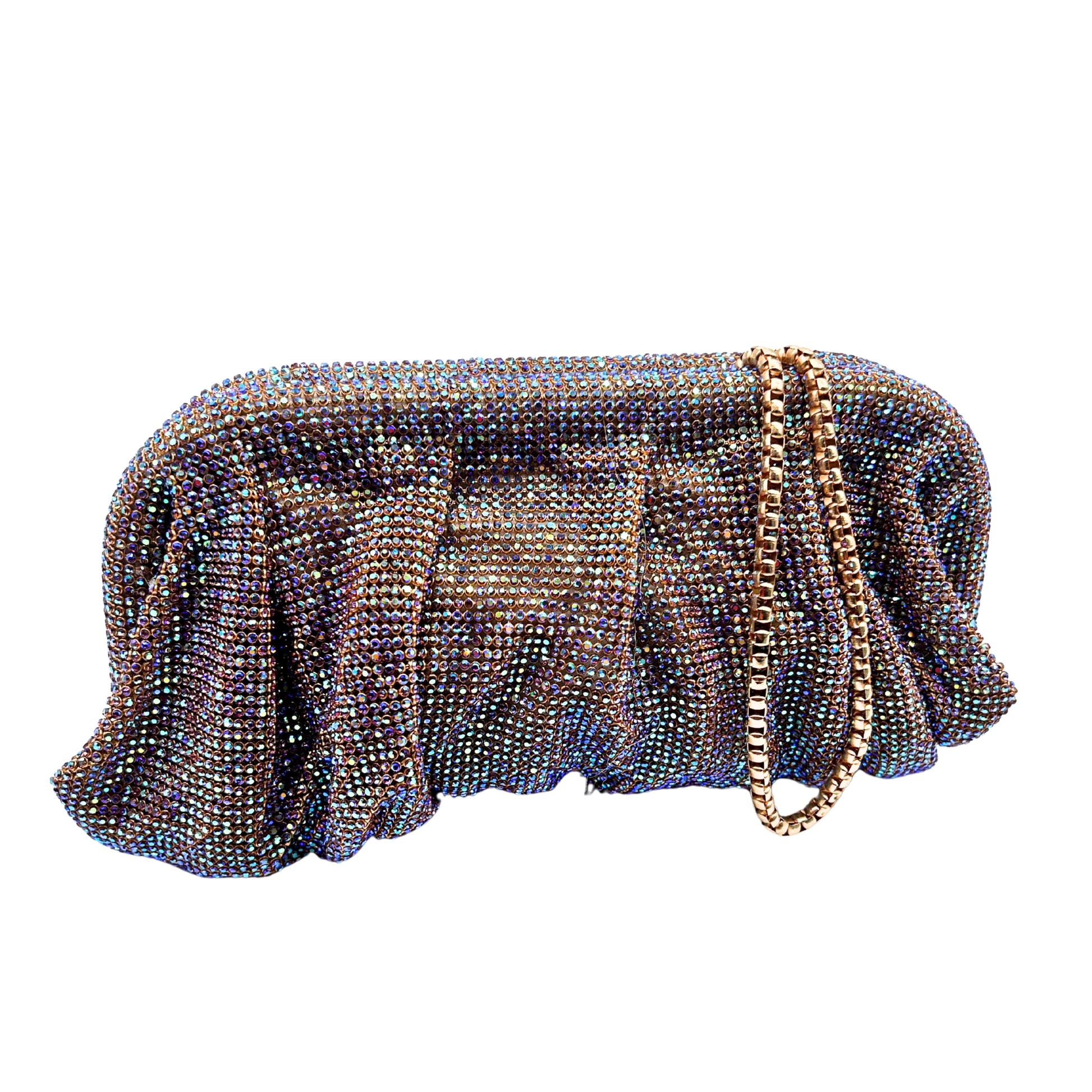 This diamante style clutch is adorned with iridescent crystals and features gold hardware with a shoulder chain for versatile wear. Finished with a classic purse frame, it’s the perfect sparkling statement for any evening look.
