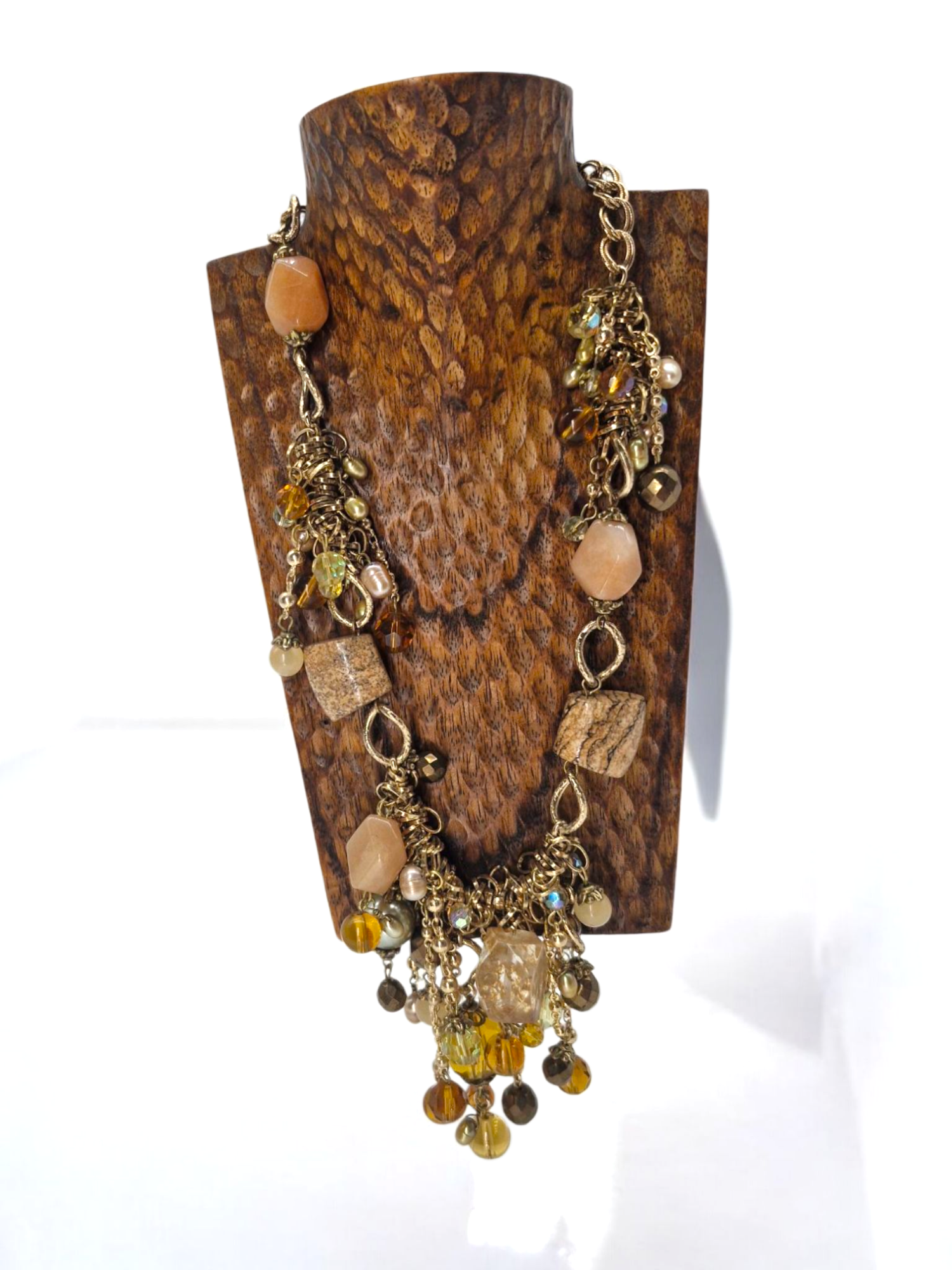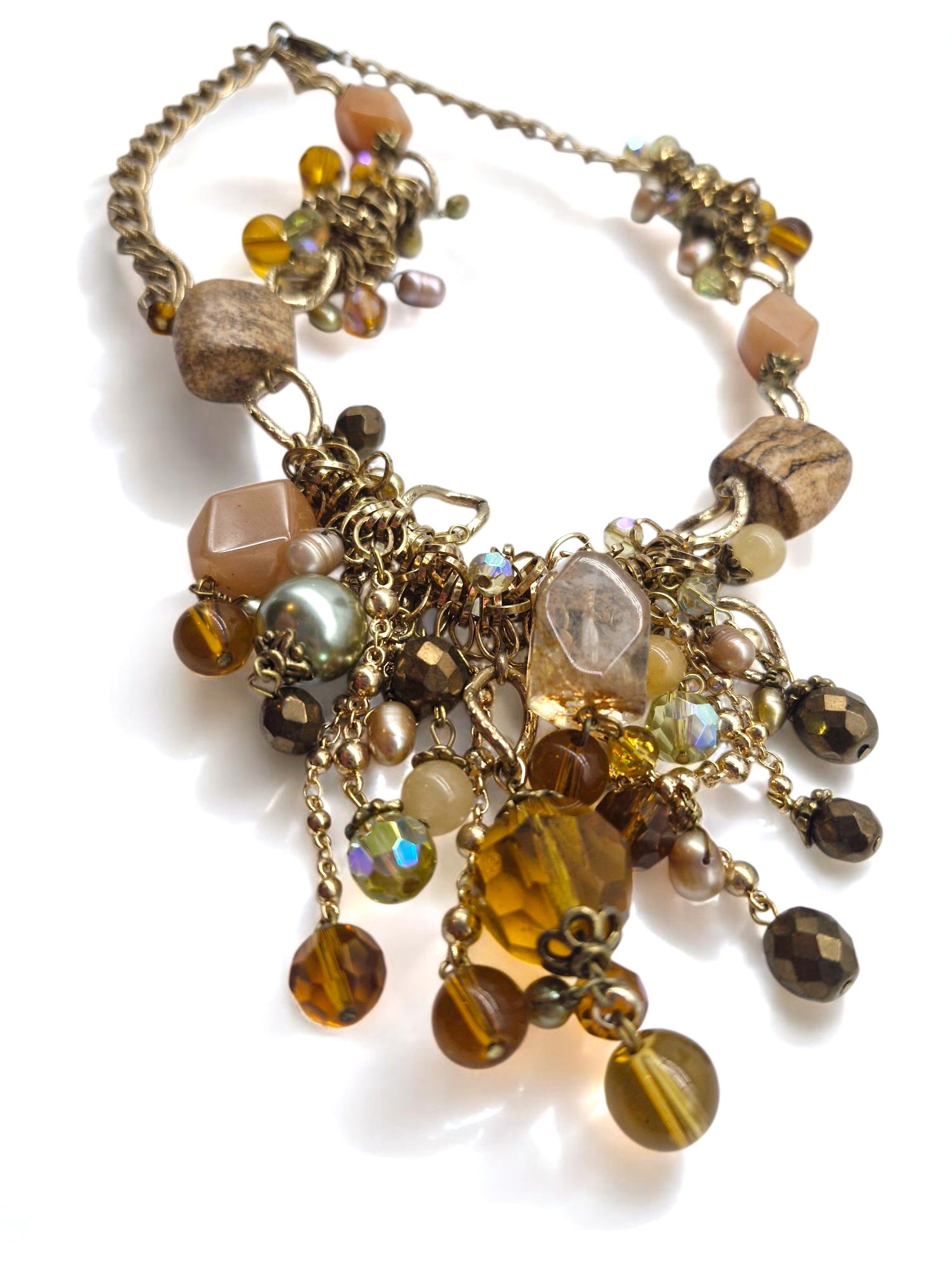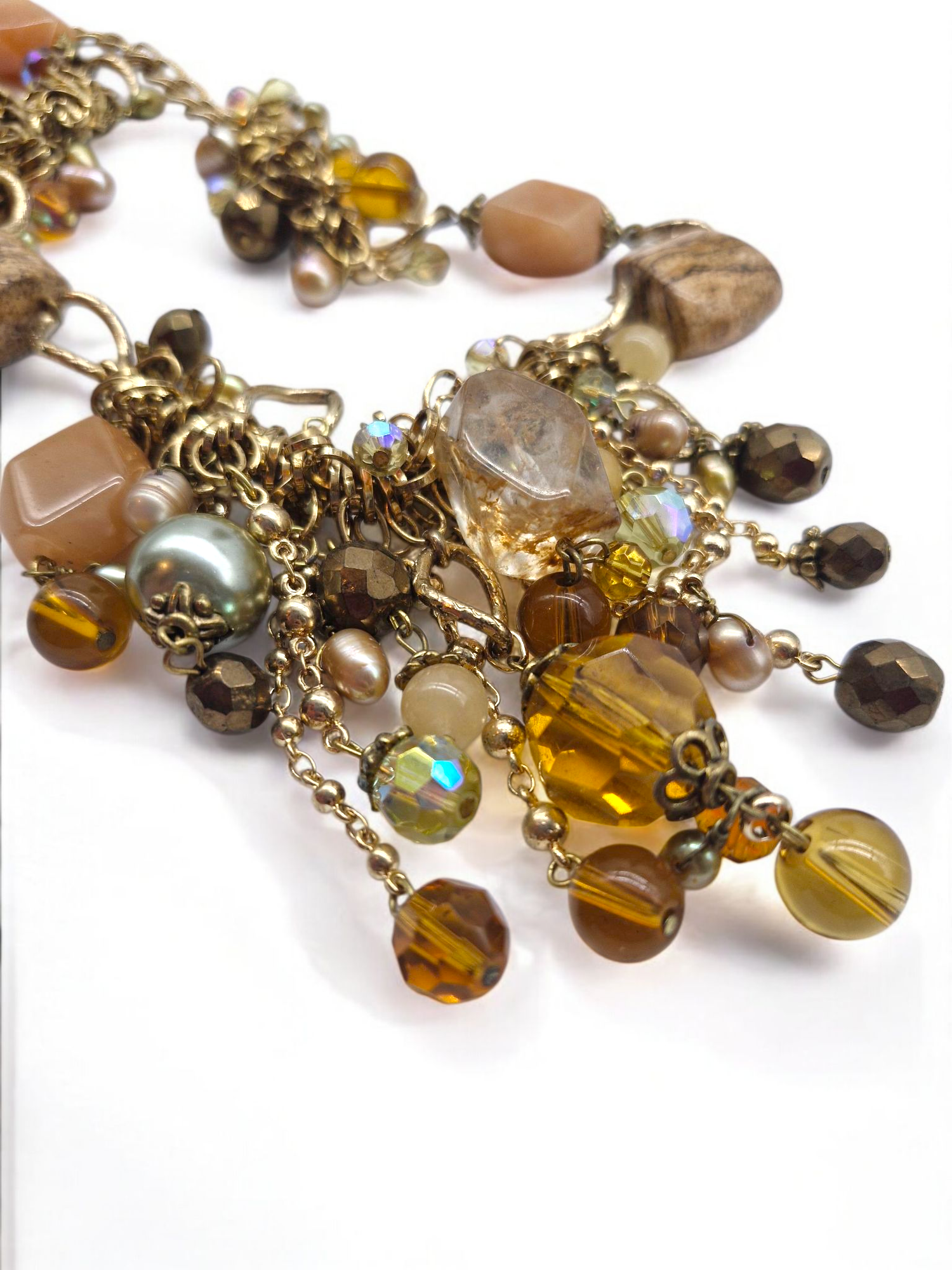 This stylish short necklace combines brown and nude tones with matte gold accents, stones, and beads, creating a fresh, modern twist on vintage Baroque style. The matte gold finish gives the piece a contemporary edge, while the earthy colours and intricate details add sophistication and unique flair. Perfect for elevating any outfit with a touch of refined elegance.