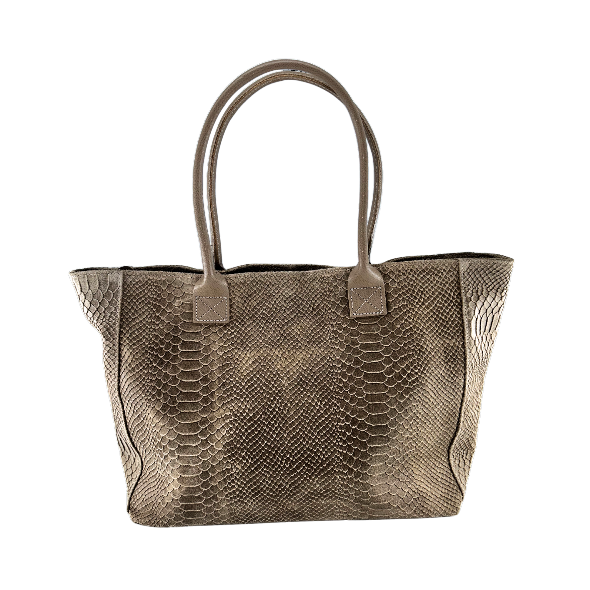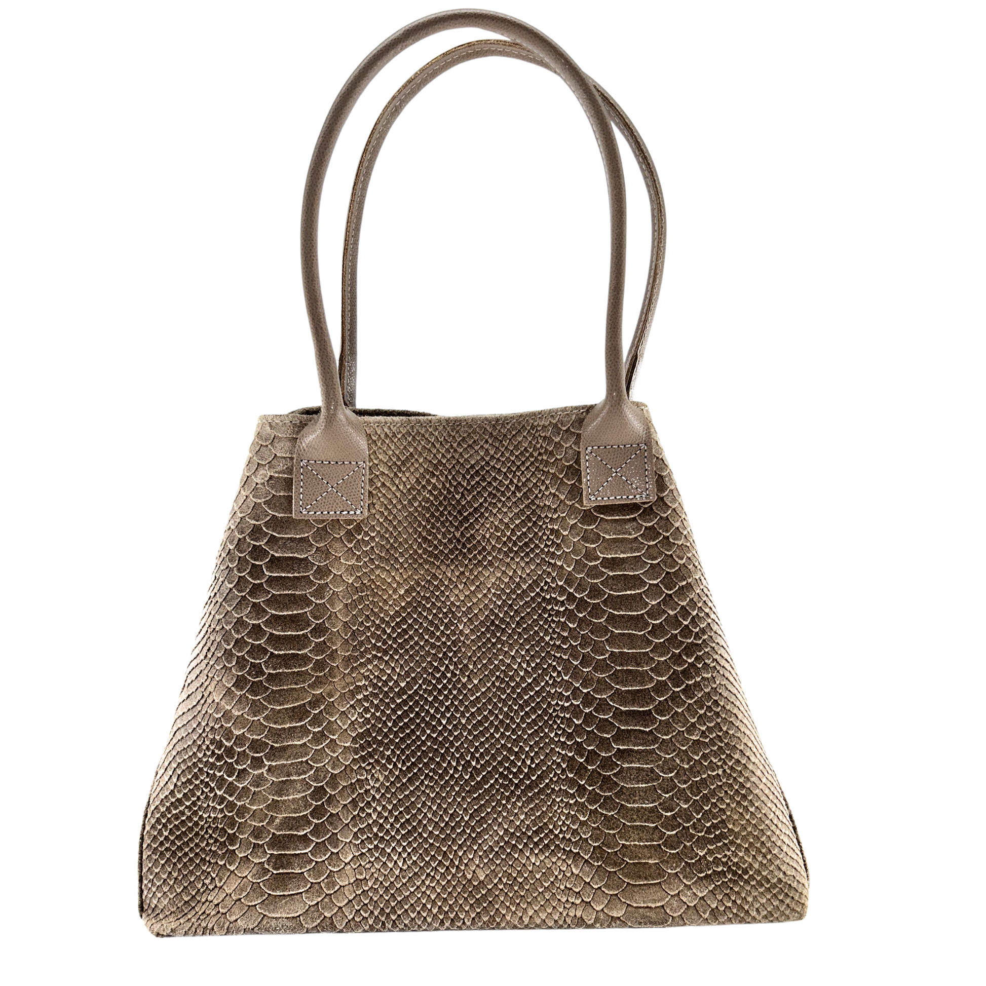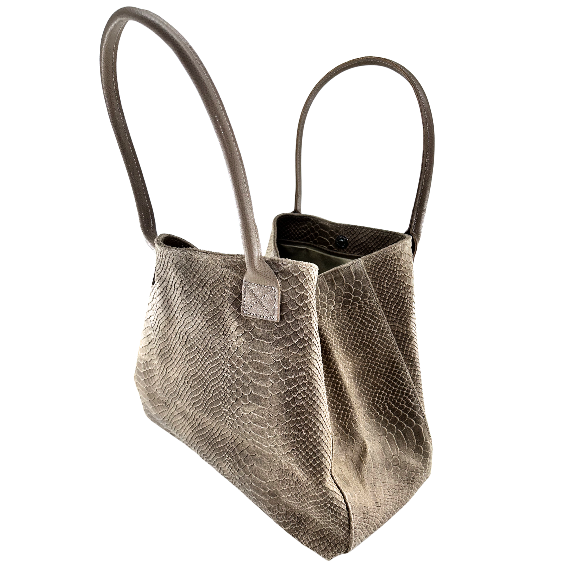 This leather tote bag is inspired by the rich texture of croc-style embossing, offering a sophisticated, textured look. Designed for shoulder wear, it features a zip closure for added security, along with a button closure that allows you to adjust the style—either as a narrow tote or a wider, more open shape. Inside, there is one compartment designed for your mobile phone and another compartment for added organization. The bag is finished with silver hardware in a mix of matte and chrome, adding a sleek, modern touch.