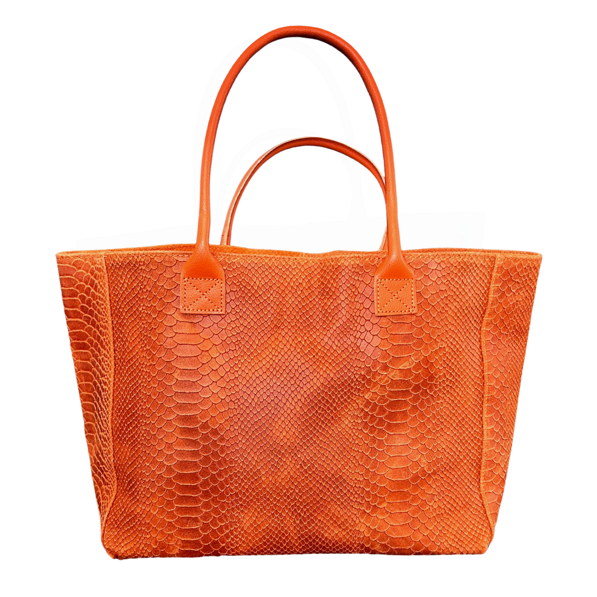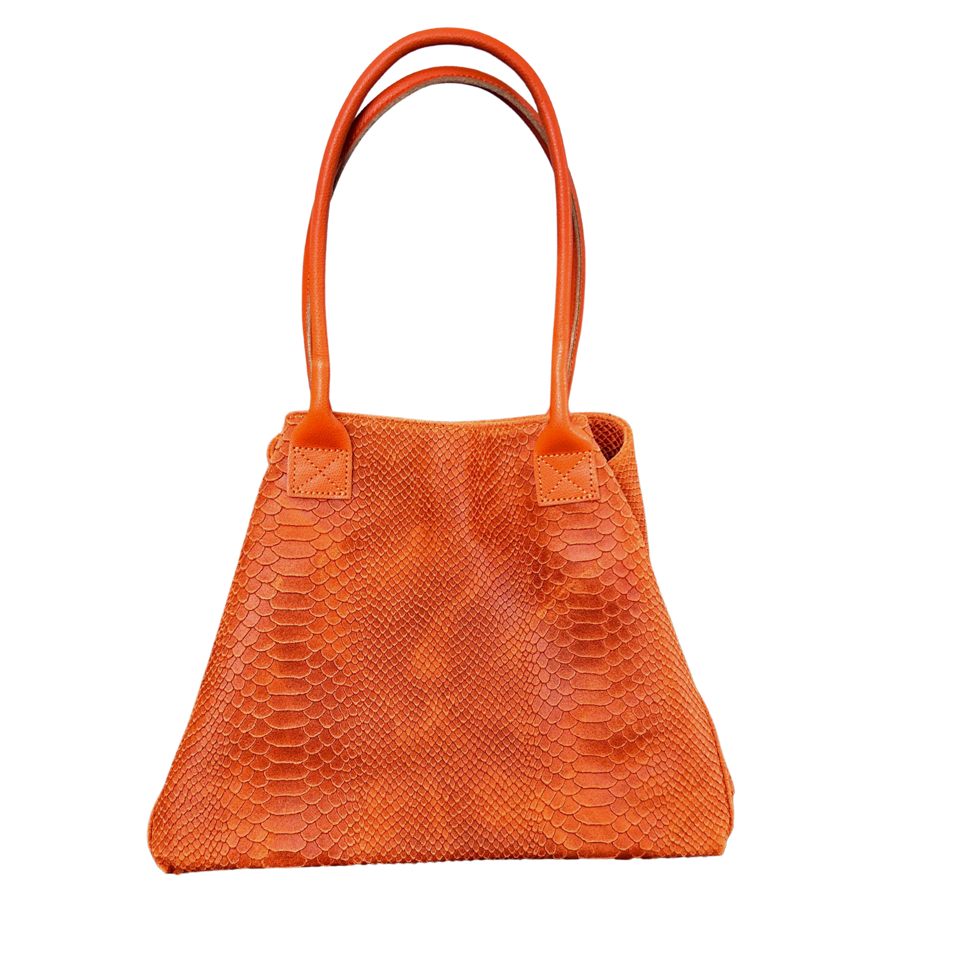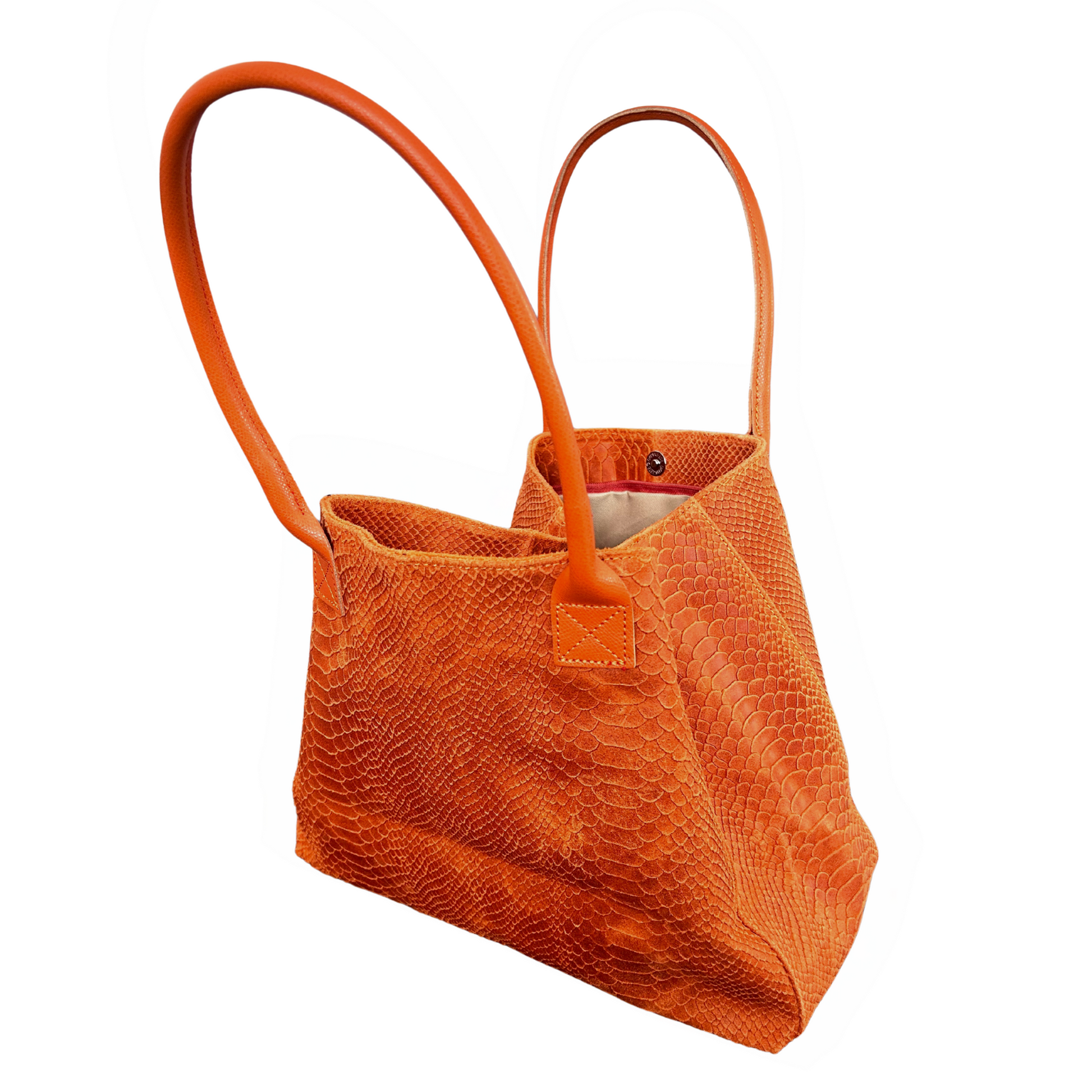 This leather tote bag is inspired by the rich texture of croc-style embossing, offering a sophisticated, textured look. Designed for shoulder wear, it features a zip closure for added security, along with a button closure that allows you to adjust the style—either as a narrow tote or a wider, more open shape. Inside, there is one compartment designed for your mobile phone and another compartment for added organization. The bag is finished with silver hardware in a mix of matte and chrome, adding a sleek, modern touch.